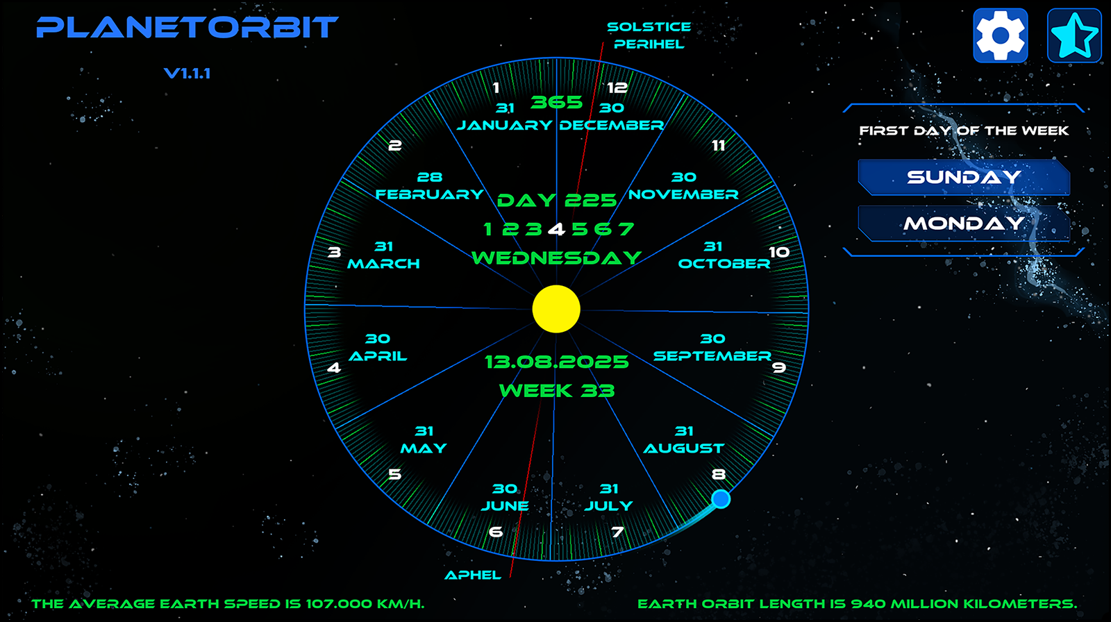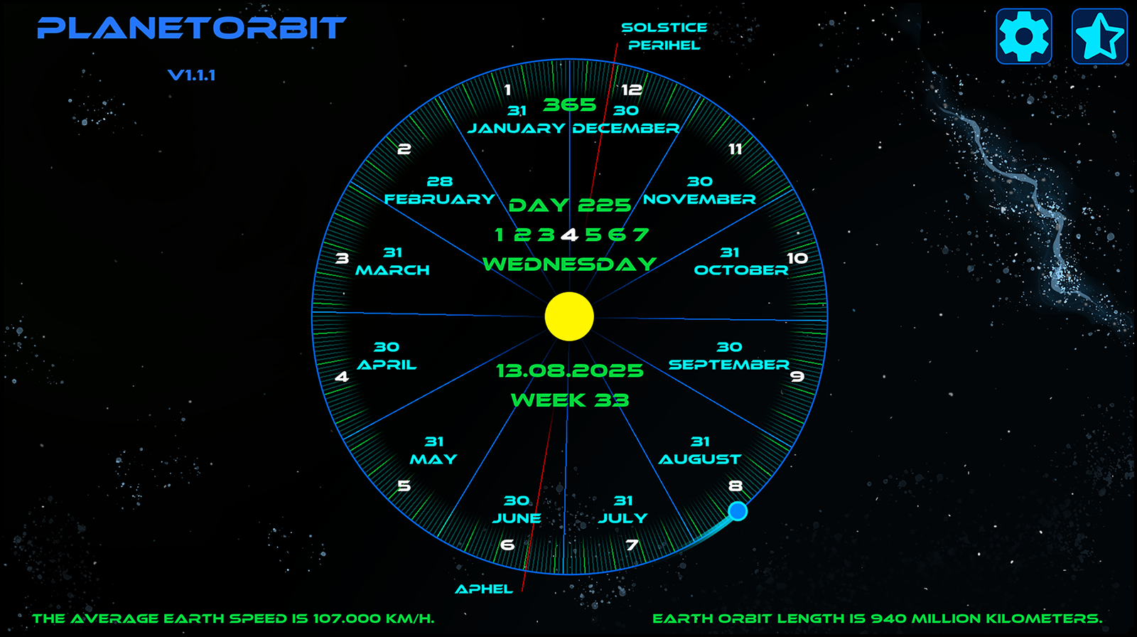 In this app you can see how the earth moves around the sun and where it is in relation to the calendar.